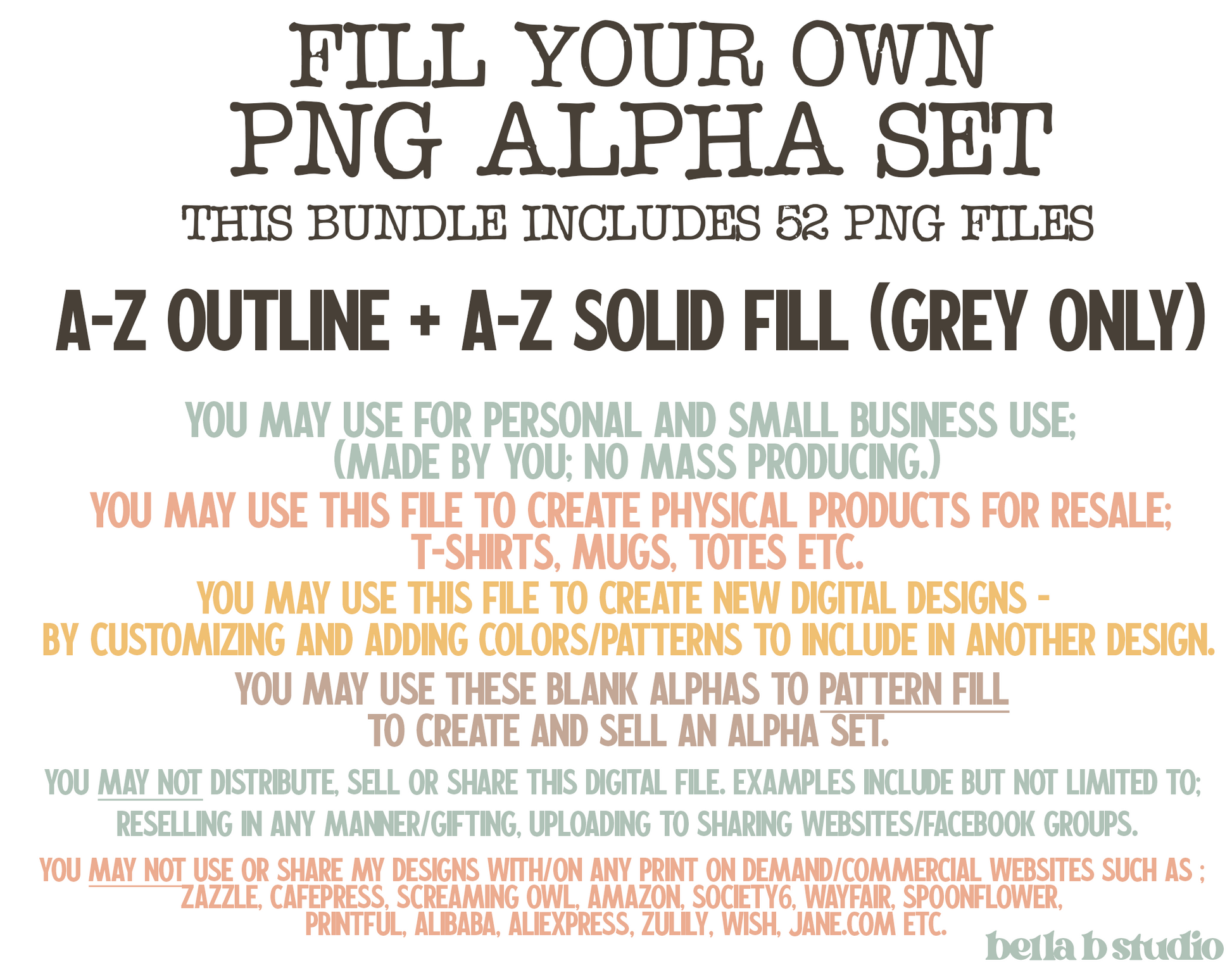 **Due to the increasing number of registered trademarked words/phrases daily, Bella B Studio is not responsible for trademark violations. If you are creating products for resell it is your responsibility to check each phrase for new trademarks in your category.