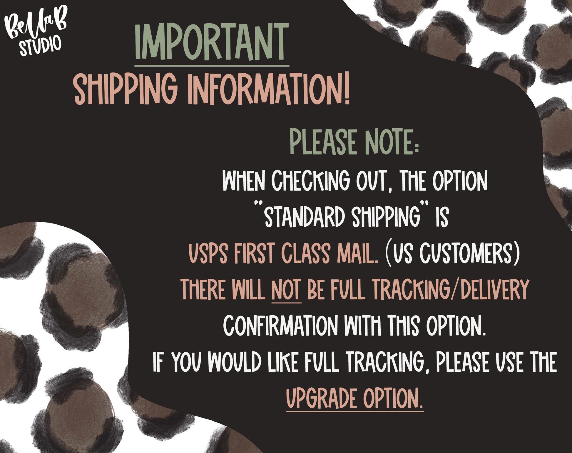 Transfers ship out every Monday. Please Note, by choosing Standard Shipping at checkout, this is USPS First Class Mail and no tracking will be available. If you would like full tracking and delivery confirmation, please choose the Shipping Upgrade.