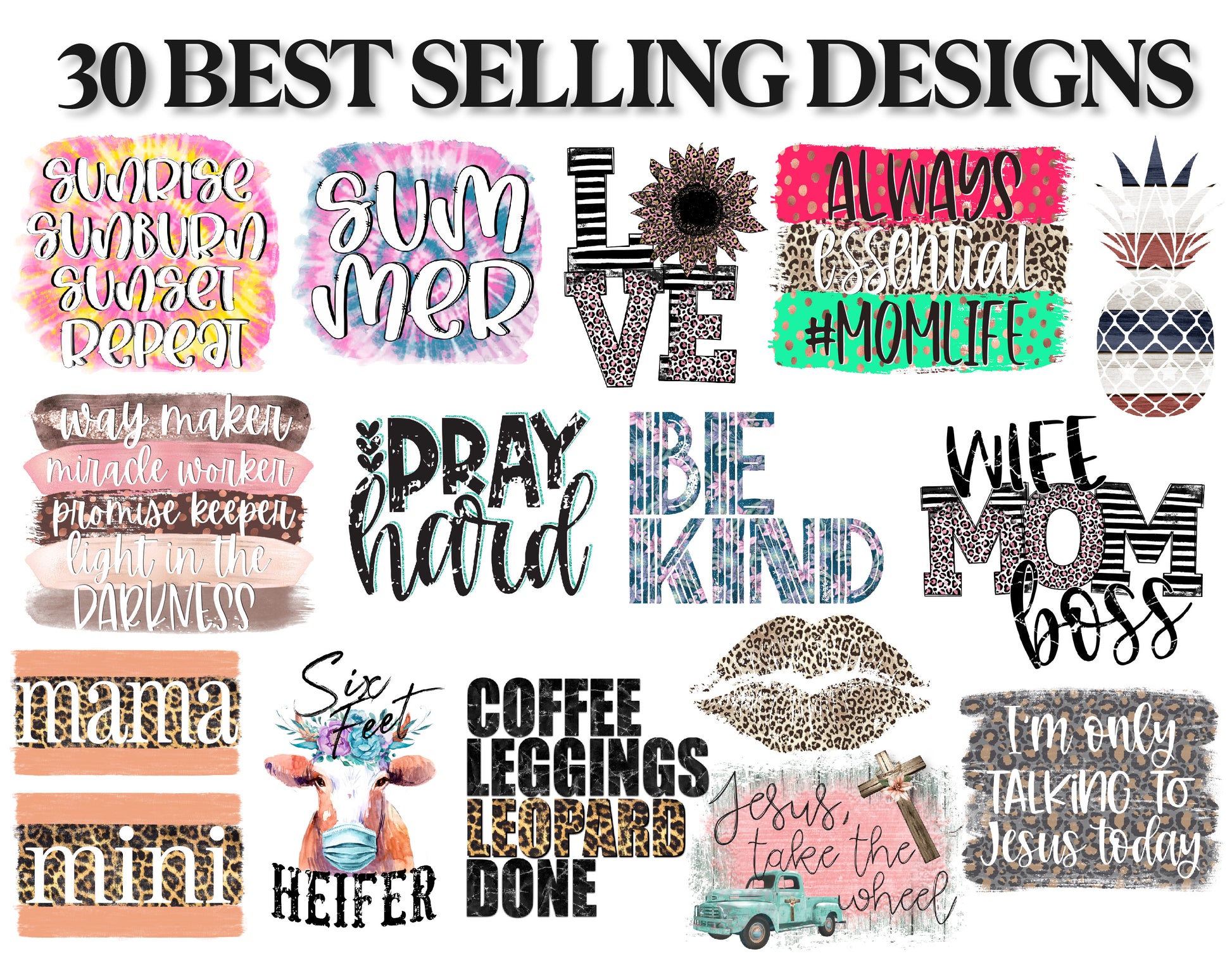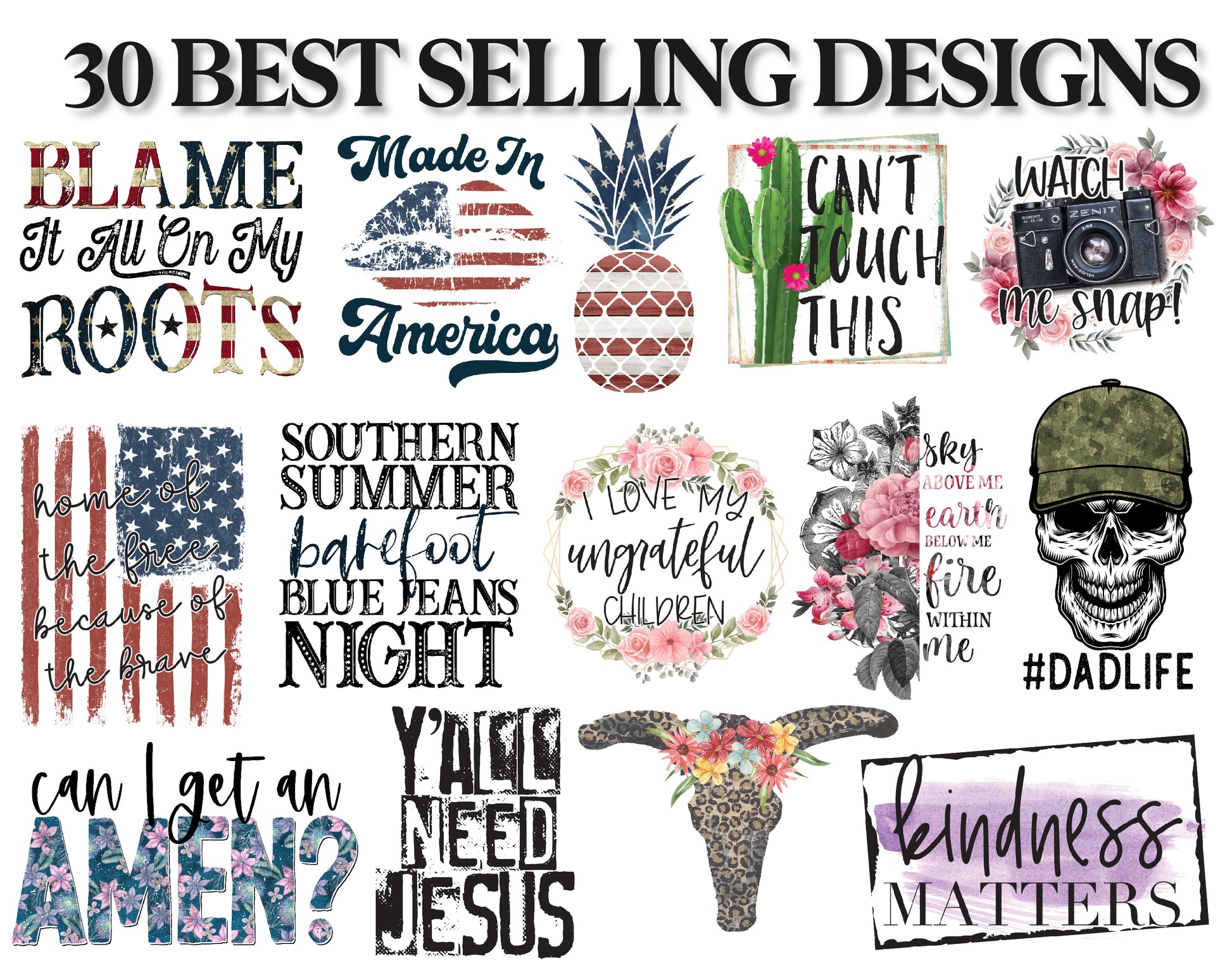 This bundle comes jammed packed with 282 Designs, with a mix of finished designs, backsplashes/backgrounds and frames, sublimation elements, alpha sets, USA states and more! It's the perfect bundle to get you started with sublimation printing and designing your own!